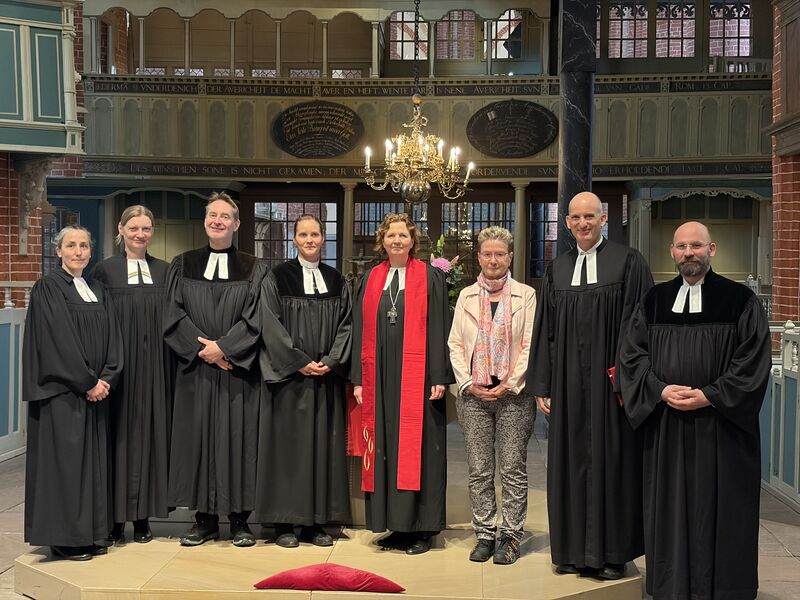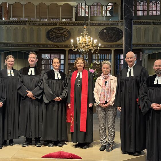 - Gruppenfoto von der Ordination mit Sabine Schiermeyer und Insa Adams sowie den Assistierenden: v.l.: Pastorin Katrin Krüger Ludgeri-Kirchengemeinde, Andrea Dorow, Pastorin in Steinhude, Ralf Matthes, Pfarrer in Memmingen, Insa Adams, Pastorin Ludgeri-Kirchengemeinde, Regionalbischöfin Sabine Schiermeyer, Herma Heyken, Kirchenvorstand und Prädikantin im Kirchenkreis Norden, Andreas Hannemann, Pastor in Sittensen und Stefan Gäb, Pfarrer im Probedienst in Lendershausen.