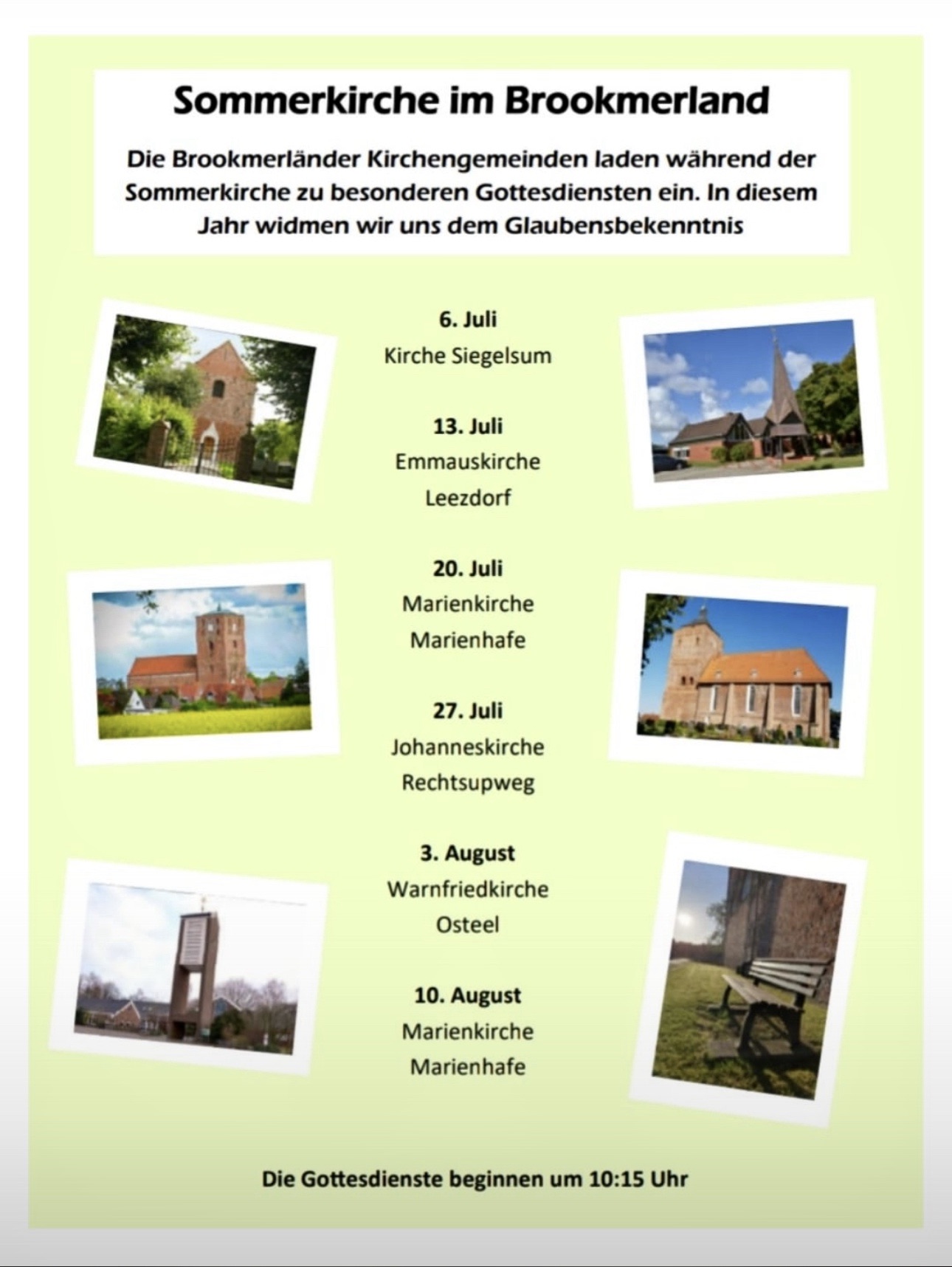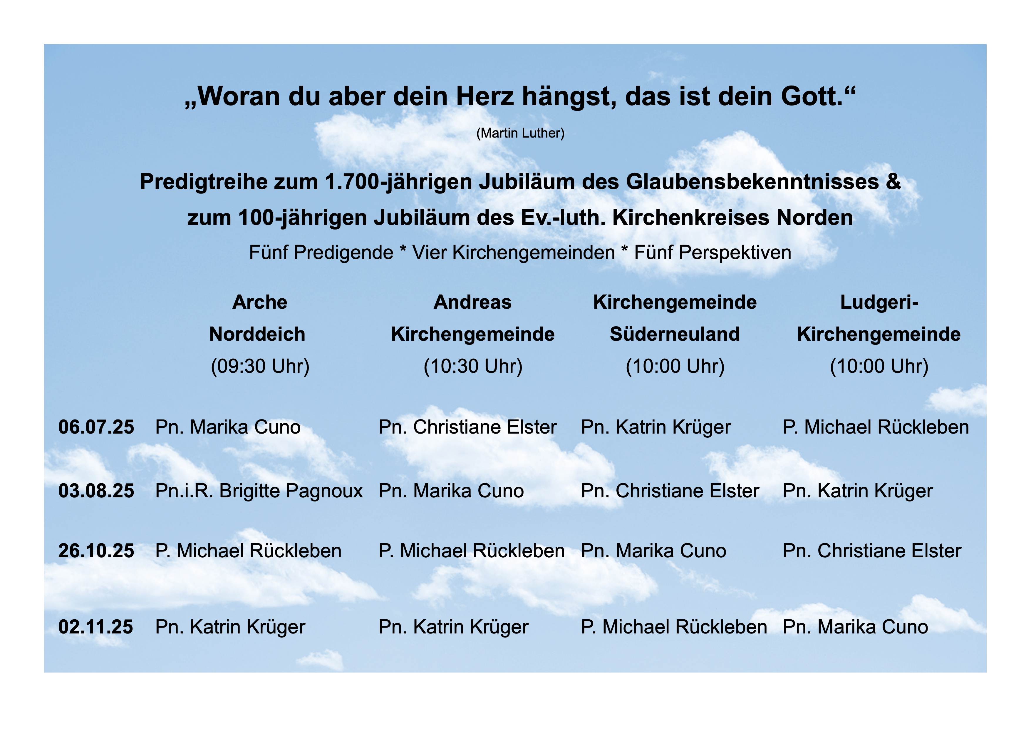 anlässlich des 100-jährigen Jubiläums des Kirchenkreises Norden starten am kommenden Sonntag, 6. Juli zwei unterschiedliche Predigtreihen zum Glaubensbekenntnis. Die Pastorinnen und Pastoren der ev.-luth. Gemeinden im Brookmerland und der ev.-luth. Gemeinden in der Stadt Norden werden in den Sommerferien bzw. bis Anfang November über das Glaubensbekenntnis predigen, das in diesem Jahr sein 1.700-jähriges Jubiläum feiert. Vielen Menschen ist das Glaubensbekenntnis aus der Konfirmandenzeit oder aus Gottesdiensten vertraut. In den Predigten wird es jeweils aus unterschiedlichen Perspektiven betrachtet. Während die Predigtreihe im Brookmerland fortlaufend an verschiedenen Orten stattfindet, werden die Predigenden in der Stadt Norden mit ihrer Predigt jeweils von Ort zu Ort reisen. Herzliche Einladung dazu!
