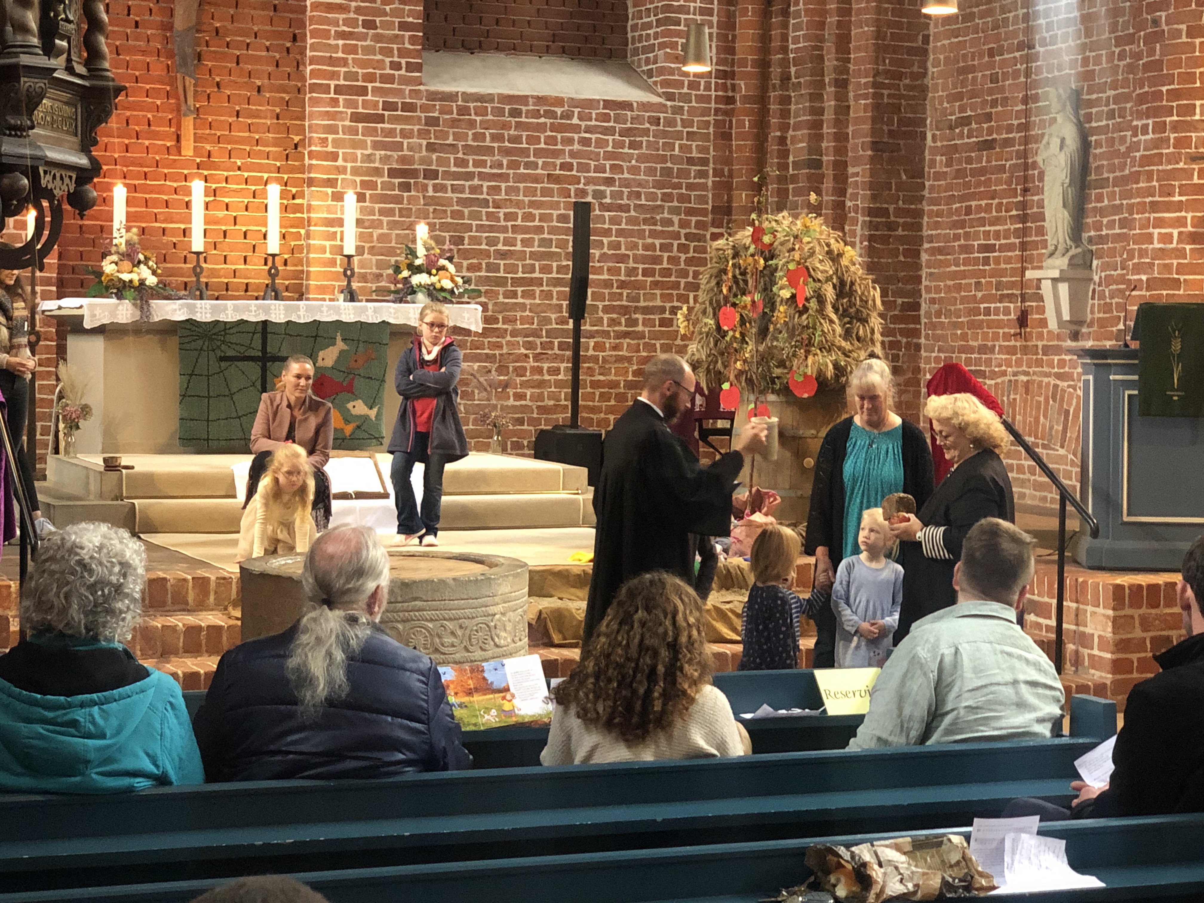 Gemeinsam mit den Kindern des Kindergartens gestaltete Pastor Klemens Niemann die Predigt. Zentrales Thema des Gottesdienstes war der Segen. Hier wurden auch die Gottesdienstbesucher einbezogen. Immer wieder wurden die Besucher aufgefordert, laut den Segen in verschiedenster Weise auszurufen. Nach den Dankesworten für den segensreichen Dienst von Gunda Fischer wurde sie von Pastor Niemann gesegnet. Beim Orgelnachspiel schwebten Seifenblasen vom Orgelboden hinab in den Kirchenraum.