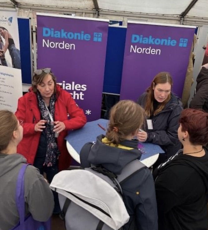 Im Rahmen der Veranstaltung informierte das Team der Diakonie über die vielfältigen Praxis- und Arbeitsfelder. Der persönliche Austausch stand hier im Vordergrund so konnten viele individuelle Fragen zu Einsatzmöglichkeiten und den Tätigkeitsfeldern besprochen werden.